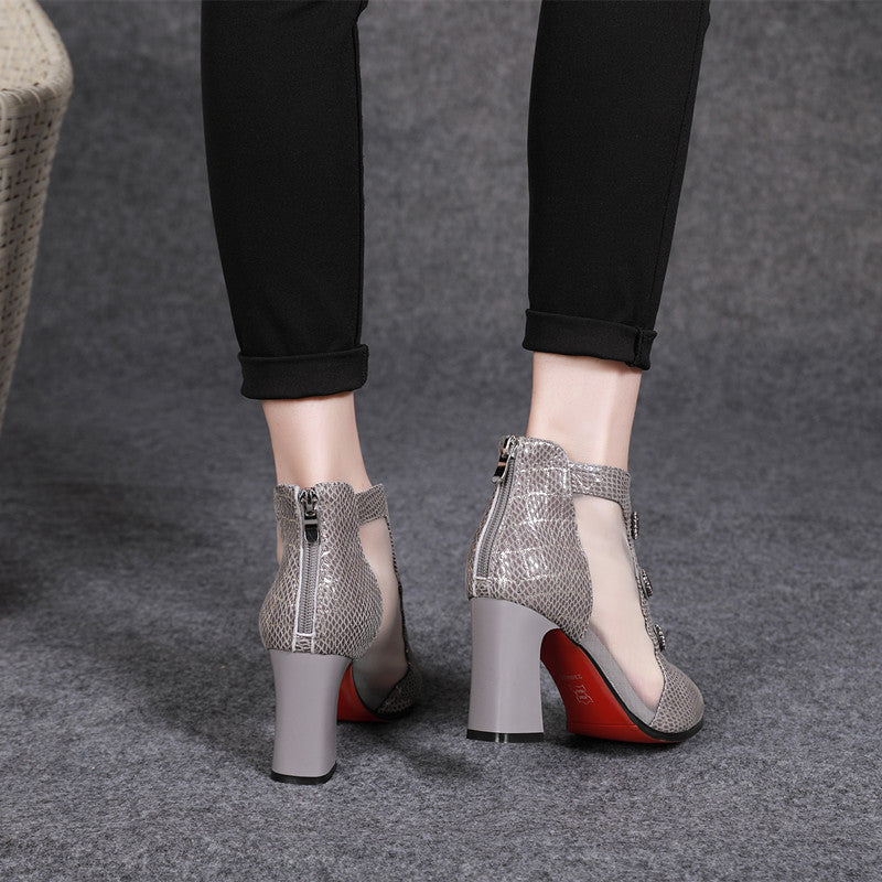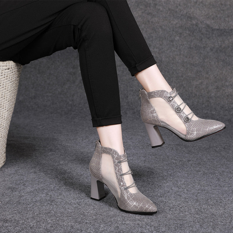 春夏新款2019尖头网靴时尚镂空粗跟高跟鞋中跟水钻凉鞋真皮凉靴子